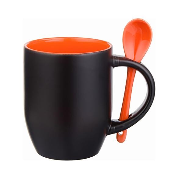 Belül színes, a bögre fülébe rakható színes kanállal.