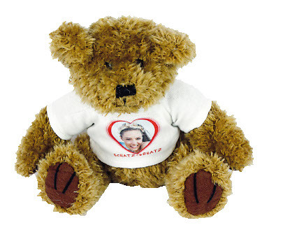 Plüss maci, szublimálható fehér M-es poliészter pólóval.